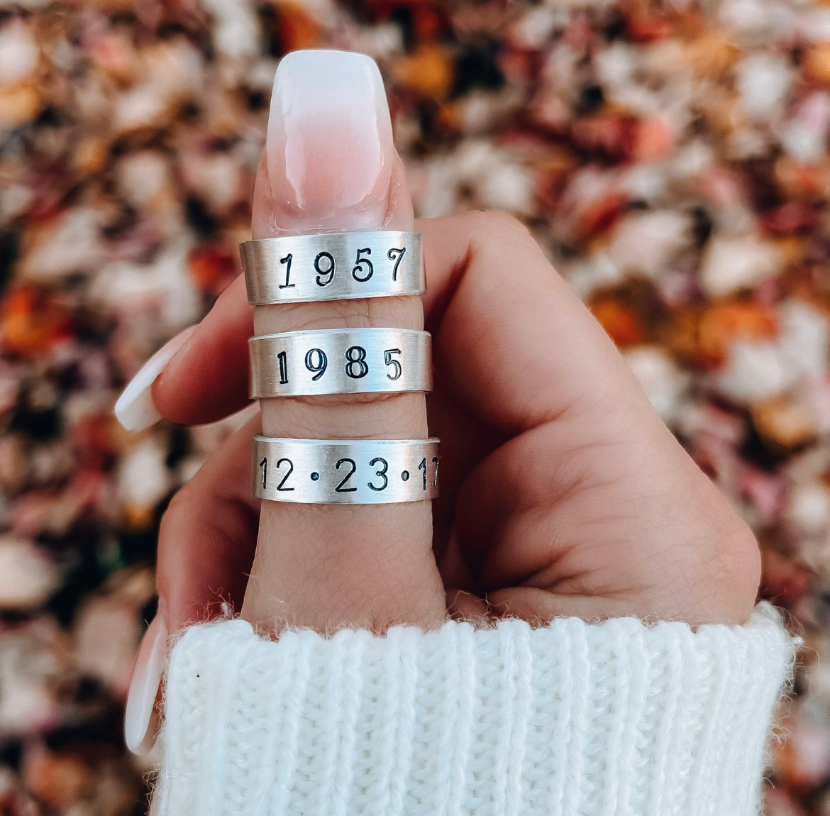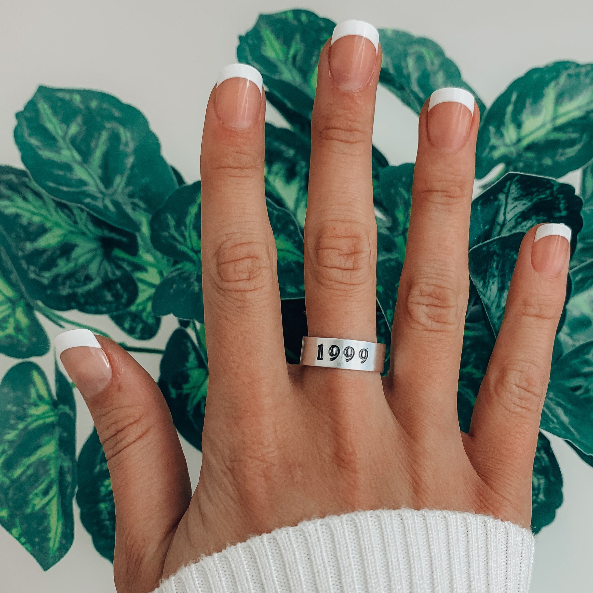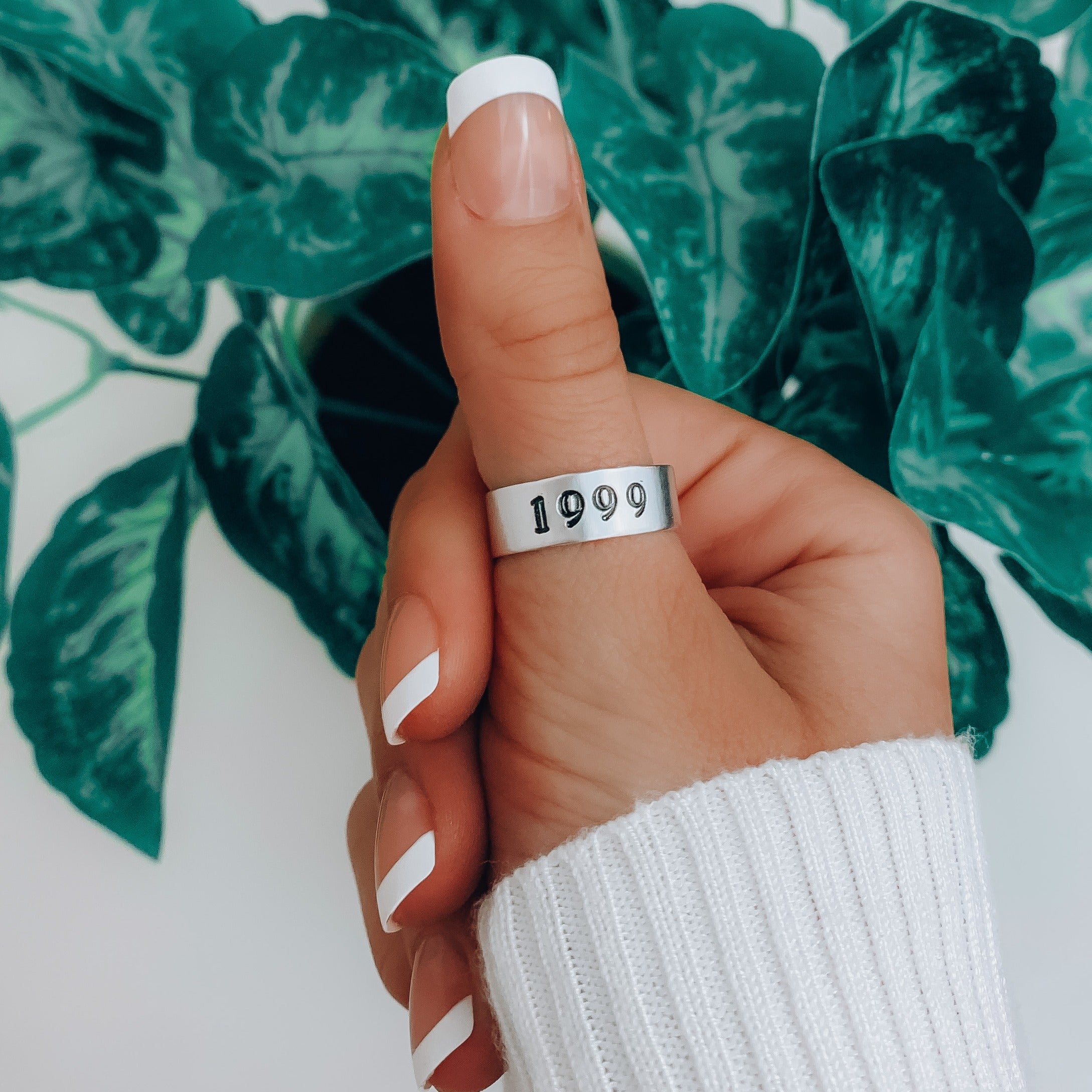 Each ring is hand stamped, unique, and customized for you! No two are the same :) The rings are Aluminum and Anti- tarnish ( meaning they will not turn your fingers green!) We offer two sizes (4-6) (7-9), the rings are ADJUSTABLE to fit your fingers perfectly!