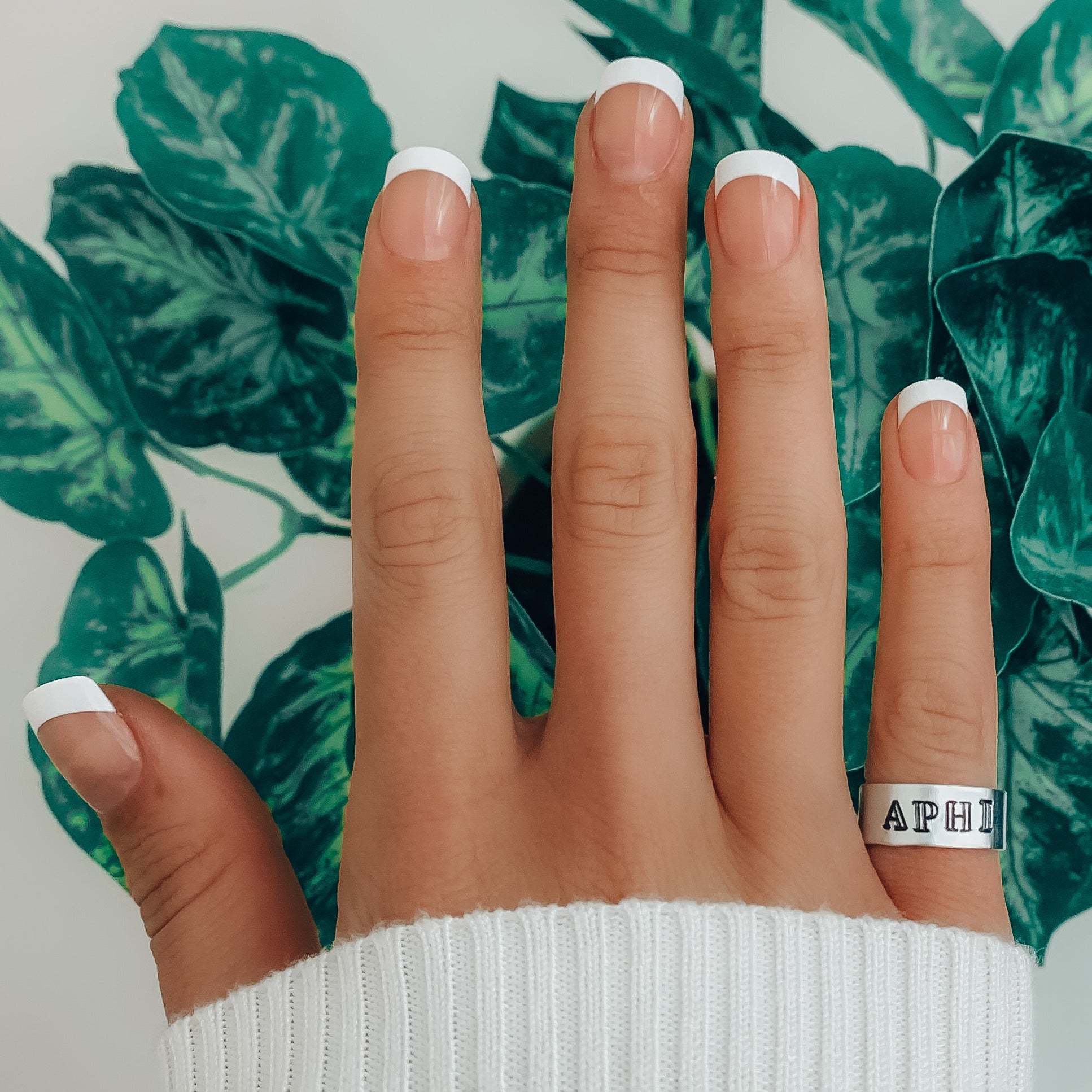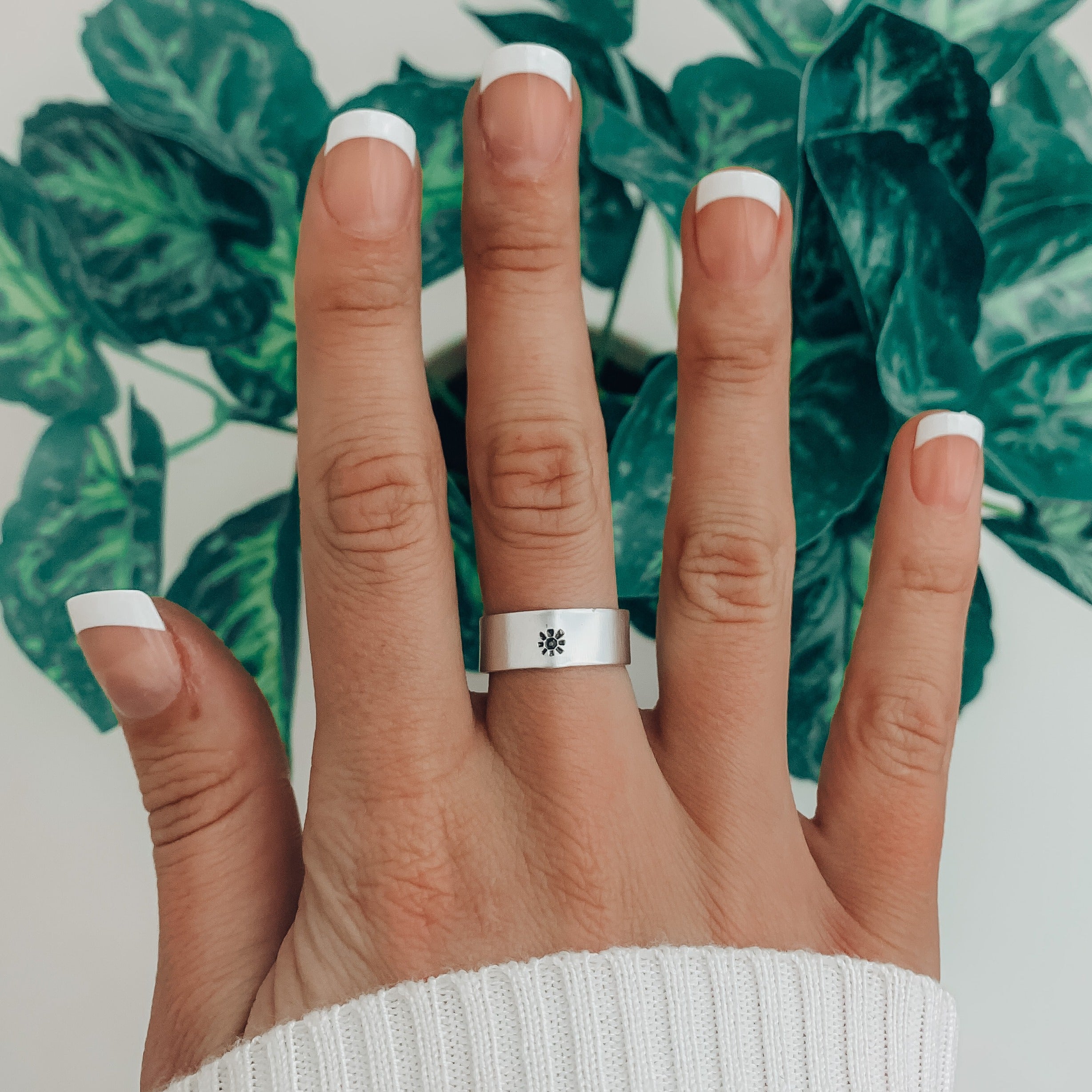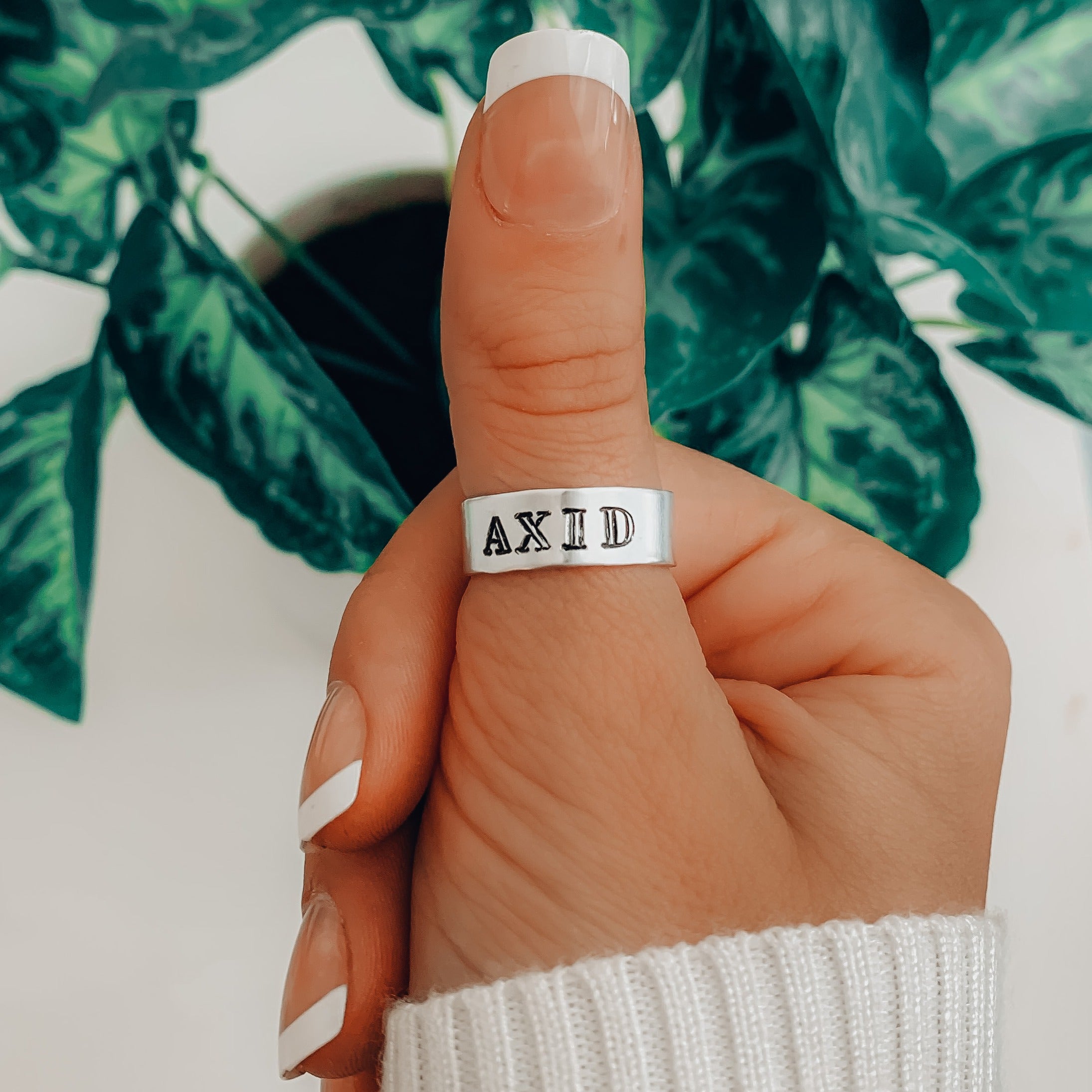 Each ring is hand stamped, unique, and customized for you! No two are the same :) The rings are Aluminum and Anti- tarnish ( meaning they WON'T turn your fingers green!) We offer two sizes (4-6) (7-9), the rings are open/ ADJUSTABLE to fit your fingers perfectly!