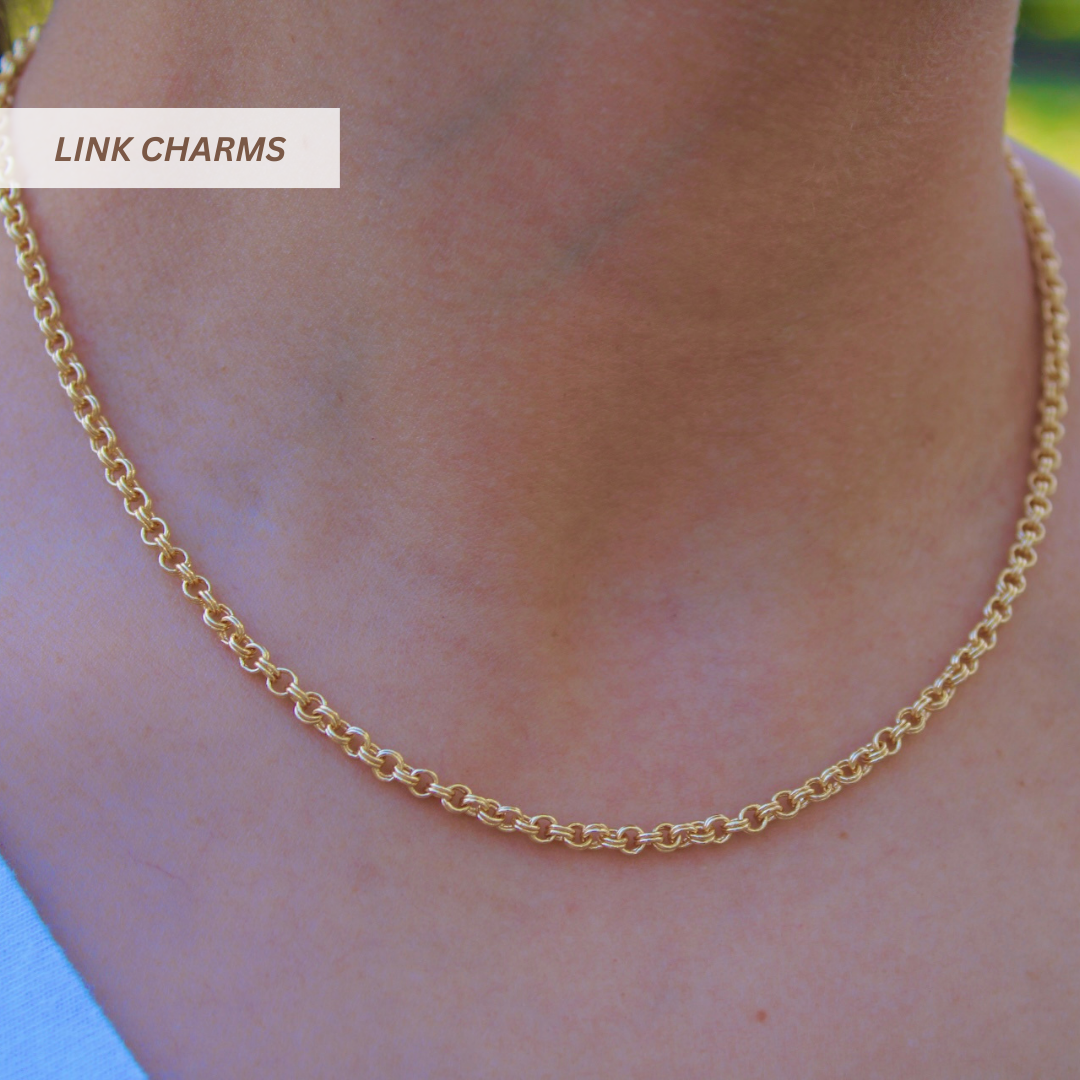 This chain will have charms LINKED to the actual chain loops (charms won't move around). Please leave me a note (note option at checkout) for the order you want the charms in.