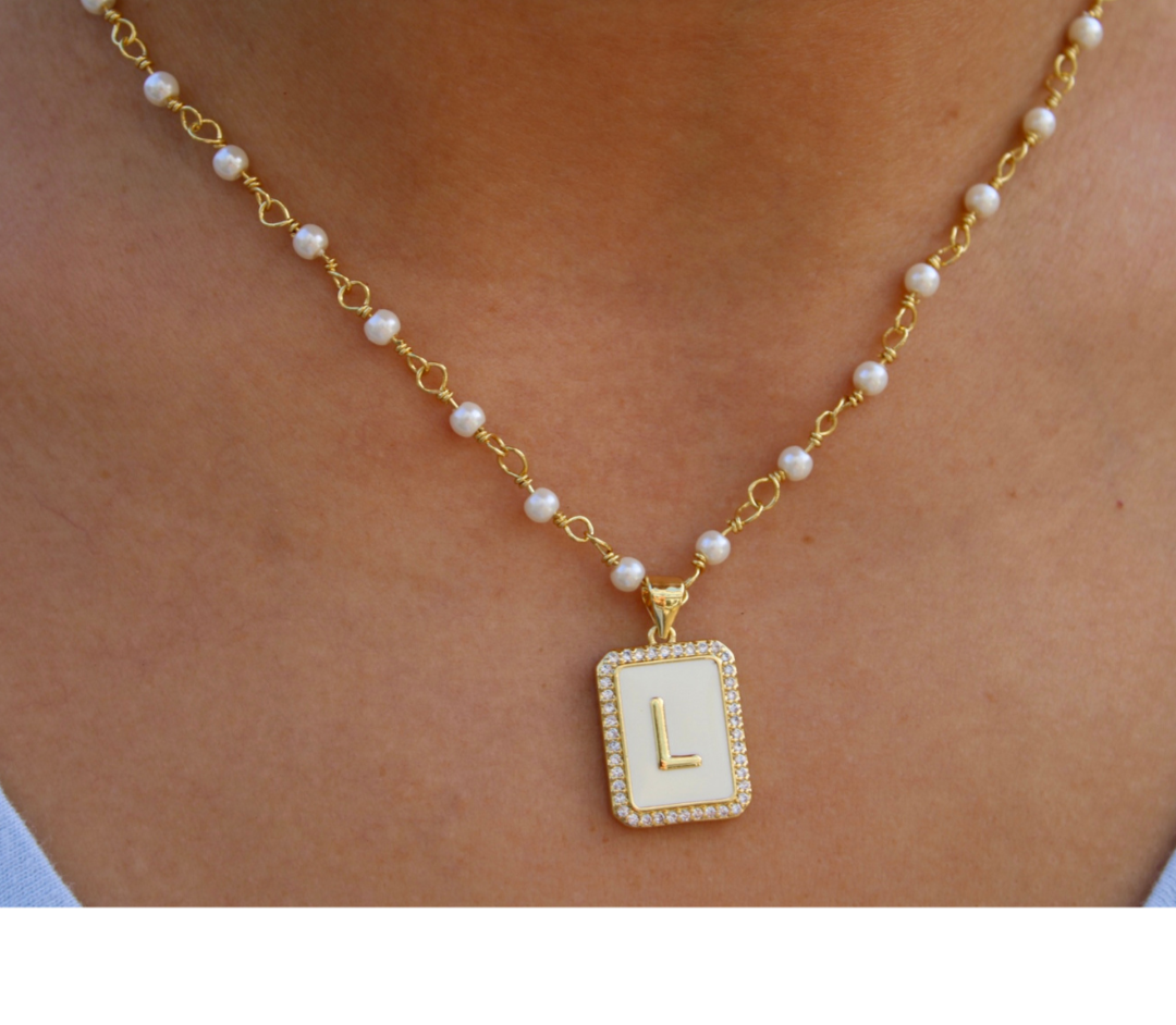 Single Pearl Necklace & White Pearl Diamond Initial Charm